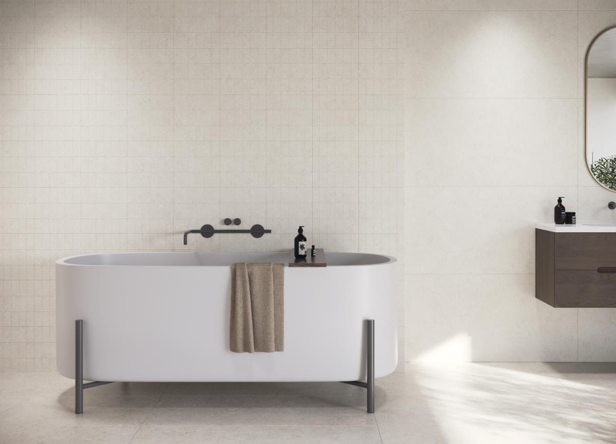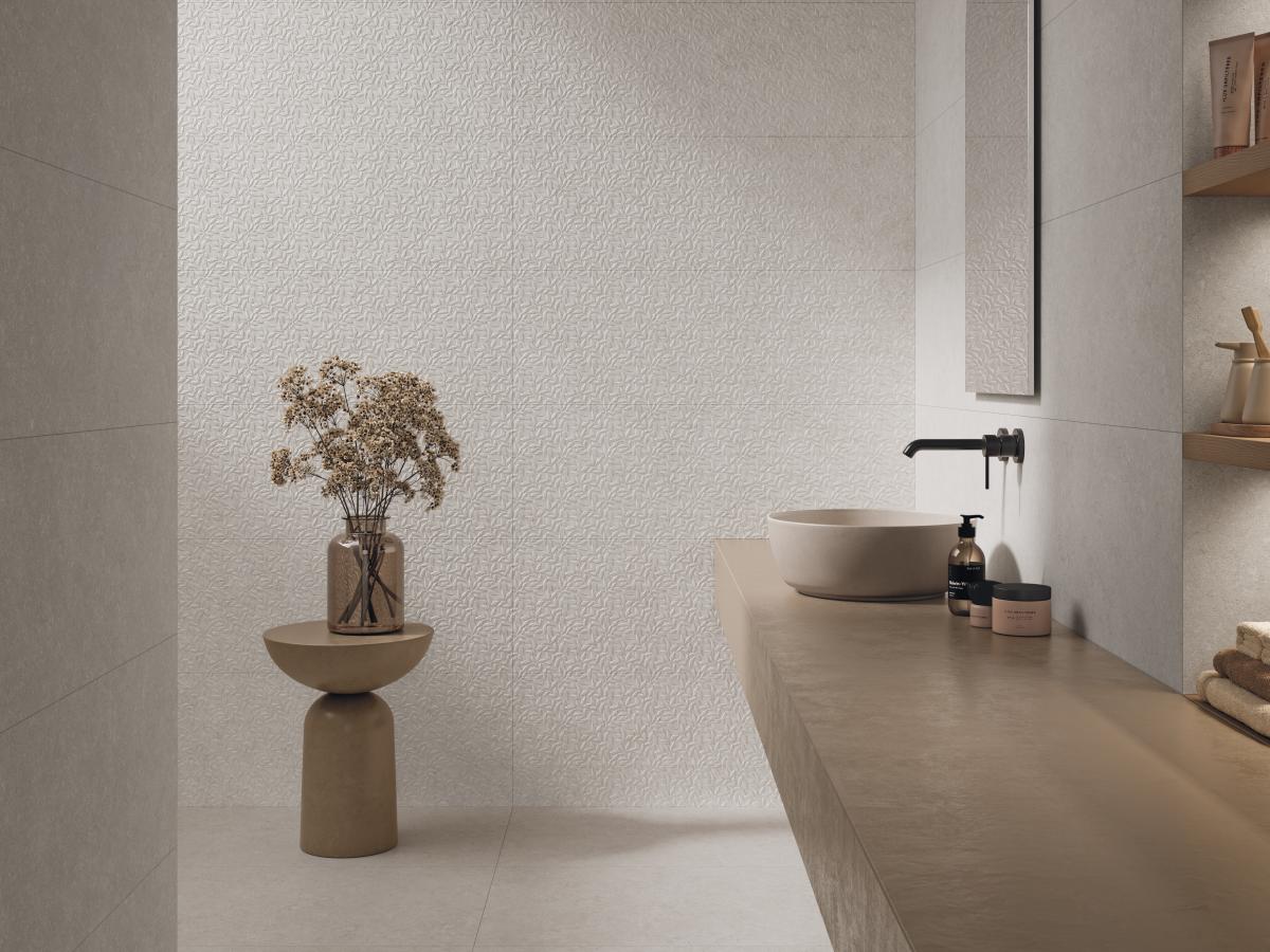 The collection’s cladding offers visual continuity and impeccable aesthetics, complemented by a relief, Leaved, whose small leaves create harmonious and coherent atmospheres.